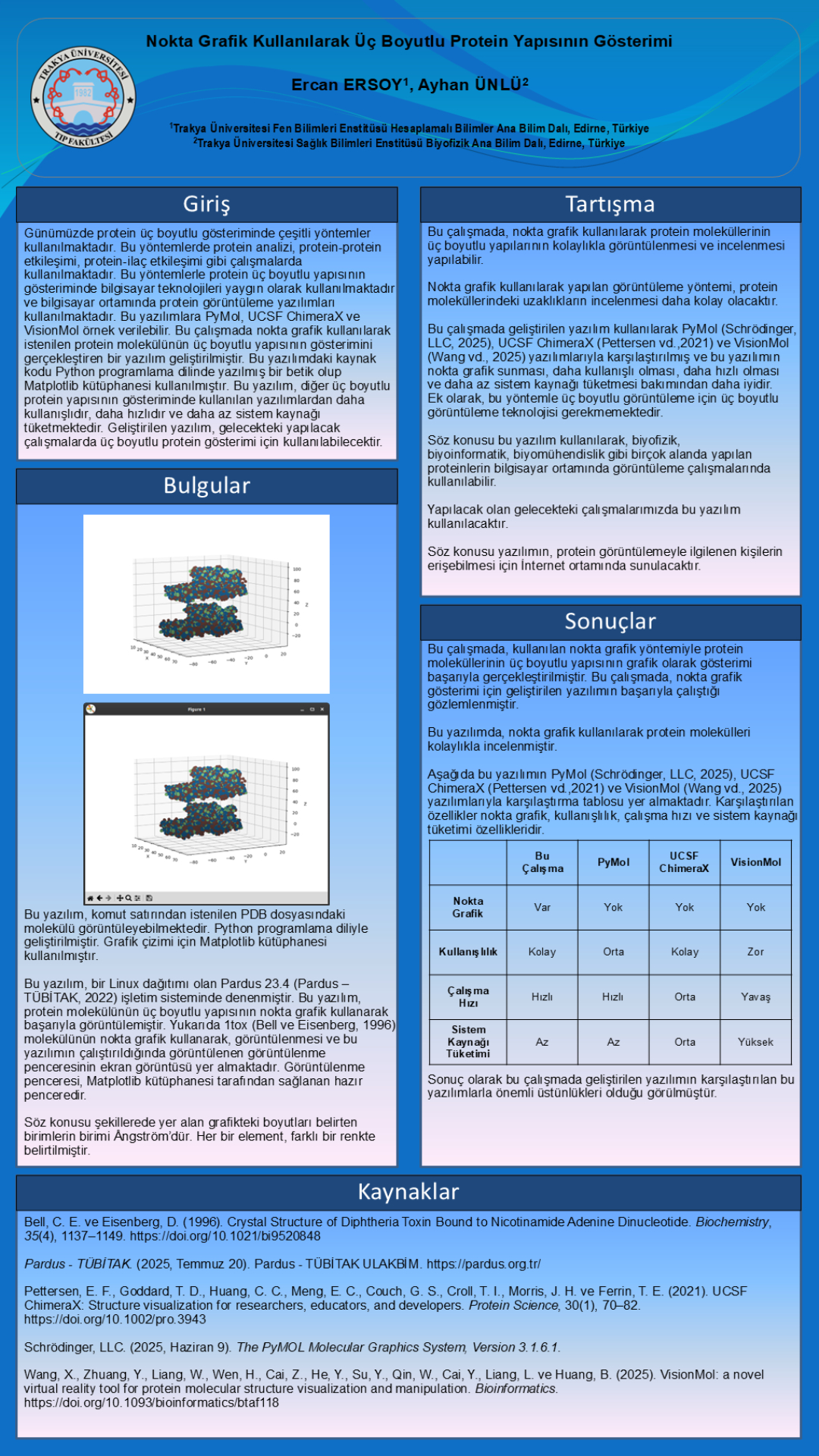 - Ercan Ersoy, Ayhan Ünlü; Nokta Grafik Kullanılarak Üç Boyutlu Protein Yapısının Gösterimi; AGBIOL 2025 Konferansı